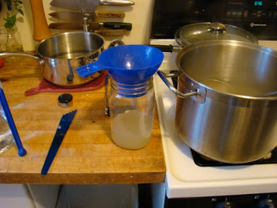 I've been looking forward to using my pressure canner for the first time. I had some frozen chicken carcasses so I simmered them for a few hours with bay leaf and peppercorns. Into the fridge to set the fat to be skimmed.
